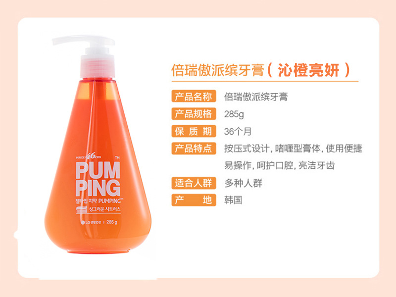 《贸》韩国LG贝瑞奥/倍瑞傲按压式PUMPING牙膏 液体瓶装285g 三色可选