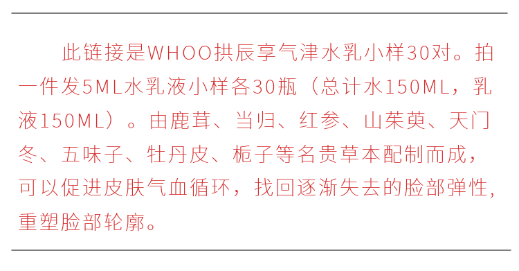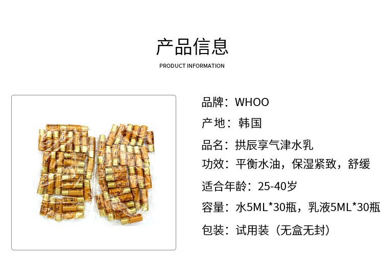 韩国whoo后 拱辰享水乳小样 平衡阴阳气津 30对 5ml/瓶