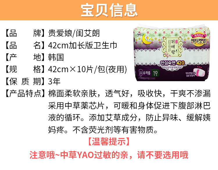 《贸》韩国 LG 贵爱娘 闺艾朗中草药无荧光剂卫生巾 29厘米日用 18片/包