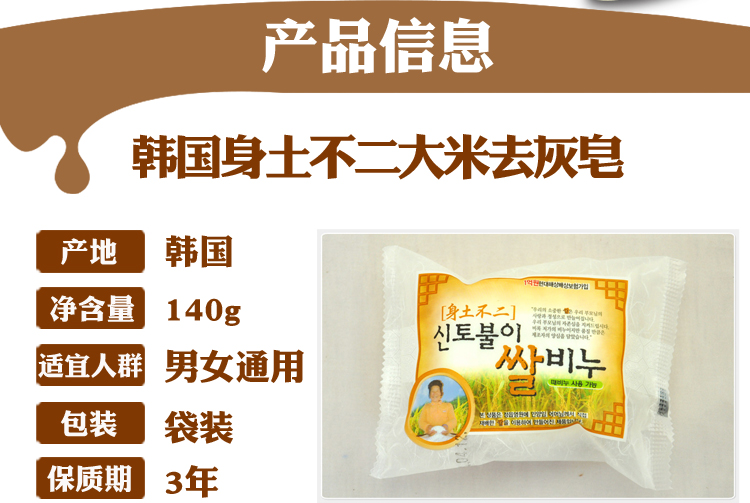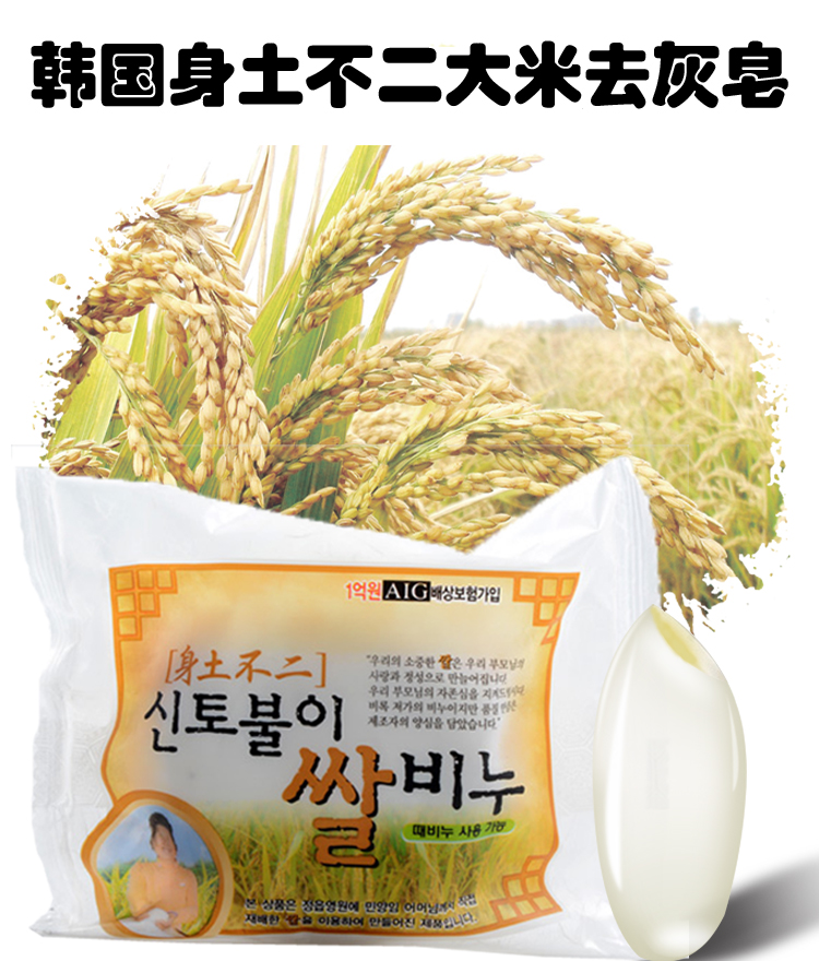 品名 韩国身土不二免搓大米皂 产地 韩国 规格 140G 型号 免搓大米皂 宝贝介绍 此款大米皂是一个身土不二的东东,很受韩国人的欢迎。 清洁彻底,用后不紧绷,洗得更透彻! 使用方法 淋浴后将身体充分泡开,将香皂涂抹全身按摩,经过了3~~5分钟后,淋浴冲掉,用手或毛巾轻轻柔搓肌肤,肌肤污垢立即清除!