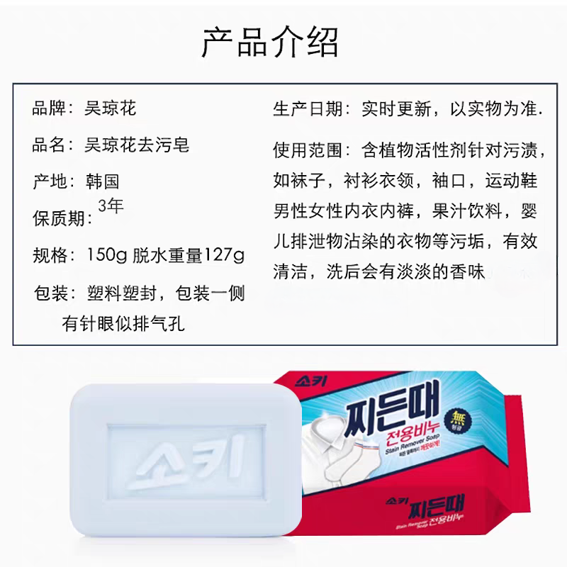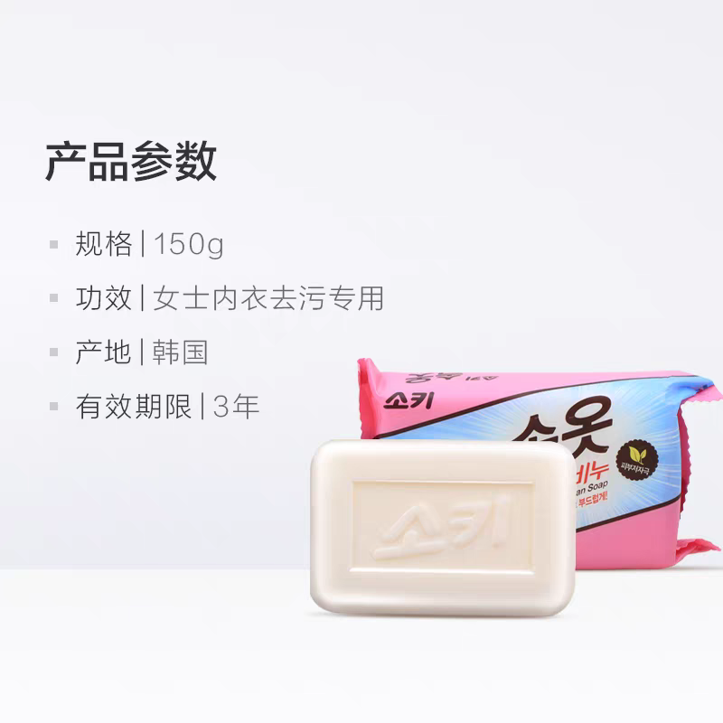 品名 韩国 芜琼花无穷花女性内衣专用皂 0756 产地 韩国 功能 消毒杀菌 清洗内衣裤 (批次不同 包装不同 随机发) 规格 150g 宝贝介绍 这款皂泡沫丰富,适用于清洗内衣裤,也可以洗衣服和床单.淡淡的清新味道,没有普通皂的遗留味,有效分解内衣残留物。