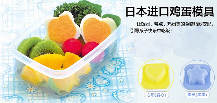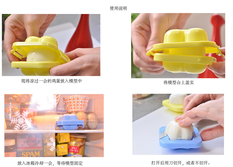 风靡日韩的鸡蛋变身模具,让平凡的水煮鸡蛋变得不平凡哦!虽然大家都知道鸡蛋水煮是最健康的,但是就是勾不起人们的食欲,尤其是小孩,现在有勒这款模具就不必担心啦,它可以把普通的水煮鸡蛋变身可爱的卡通形象,吸引小朋友们的视线,保准吃得快呢!在日本和韩国,你也可以经常看到大人们的饭盒中有这样一颗卡通鸡蛋哦!使用方法也很方便哈,而且稍微挤压后的鸡蛋,口感会更好。